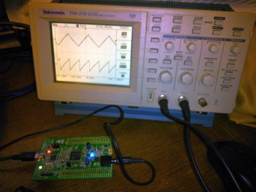 Może nie do końca tak związane z C= (zwłaszcza na typ etapie hehee). Ale od jakiegoś czasu męczę STM32F4 Discovery (w skrócie: Cortex M4, nominalnie 168 MHz, podobno do mniej więcej 250 można popędzać, mega flaszki+192k RAMu wewnętrznie, 16 bitowy D/A ze wzmacniaczem podpięty po I2S), zrobiłem sobie "foto na pamiątkę" z pierwszego podpięcia pod oscyloskop: